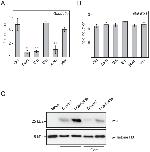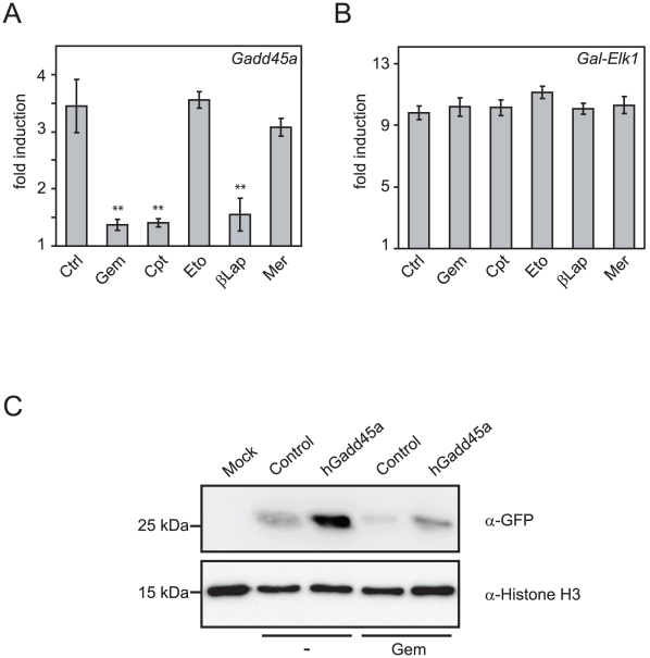 Figure 1. Gemcitabine inhibits Gadd45a mediated gene activation.(A–B) Luciferase reporter assays of HEK293T cells transiently transfected with HpaII in vitro methylated Gal-responsive reporter, together with either Gadd45a (A) or Gal-Elk1 (B, specificity control). Cells were treated with DMSO (control, Ctrl), gemcitabine (Gem), camptothecin (Cpt), etoposide (Eto), β-lapachone (βLap), merbarone (Mer) as indicated. Shown is the fold activation by Gadd45a (A) or Gal-Elk1 (B) over control transfected cells. Error bars represent standard deviation. Significance was assessed via unpaired Student's t-test using the control sample as reference: ** = p<0.01. (C) Western blot analysis of EGFP expression. Whole cell extracts of HEK293T cells transiently transfected with in vitro methylated pOctTK-EGFP reporter with Gadd45a or pBl-KS (control), with or without gemcitabine treatment as indicated.