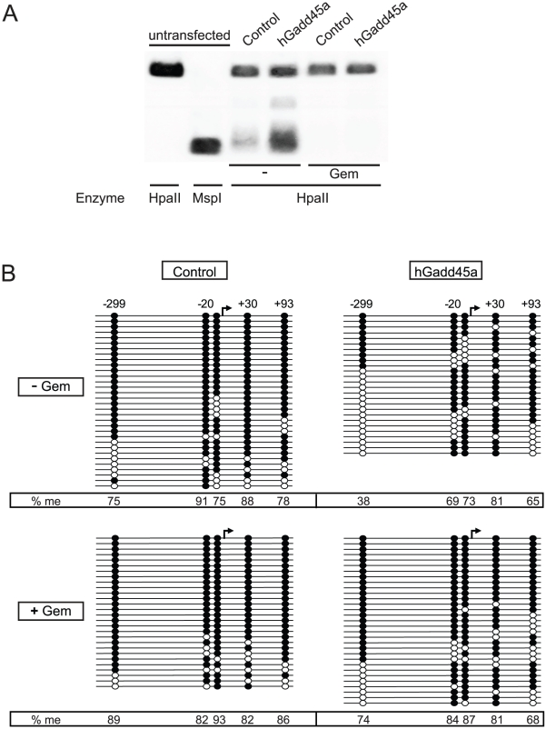 Figure 2. Gemcitabine impairs Gadd45a mediated demethylation.(A) Methylation-sensitive Southern blot. HpaII in vitro methylated plasmid pOctTK-EGFP was recovered from HEK293T cells after transient co-transfection with Gadd45a or pBl-KS (control), with 65 h gemcitabine treatment as indicated. Recovered plasmids were digested with the indicated restriction enzyme and the products analyzed by Southern blot using a GFP probe. (B) Bisulfite sequencing analysis of five HpaII sites within the pOctTK regulatory region upon transient transfection and treatment as in (A). White and black circles, unmethylated, methylated CpG, respectively. Arrow marks EGFP translation start site.