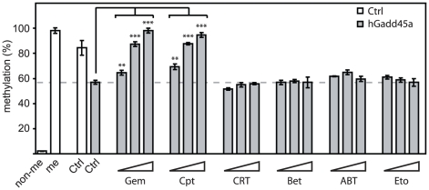 Figure 3. Gadd45a mediated DNA demethylation is unaffected by BER inhibitors.Methylation status of the HpaII site −299 (see Fig. 2B) in the pOctTK-EGFP regulatory region was assayed by methylation sensitive PCR 48 h after transient co-transfection with or without hGadd45a. Cells were treated with the topoisomerase II inhibitor etoposide (Eto), the NER inhibitors gemcitabine (Gem) and camptothecin (Cpt), or the BER inhibitors CRT 0044876 (CRT), betulinic acid (Bet) and ABT-888 (ABT) as indicated. Untransfected unmethylated (non-me) and HpaII in vitro methylated reporter plasmid (me) served as reference. Significance was assessed via unpaired Student's t-test using the untreated Gadd45a transfected sample as reference: * = p<0.05; ** = p<0.01; *** = p<0.001.
