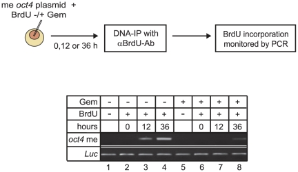 Figure 4. Gemcitabine inhibits unscheduled DNA synthesis of methylated DNA.Methylated oct4 plasmid was injected with or without BrdU into Xenopus oocytes in presence or absence of gemcitabine (Gem) and recovered after incubation (see diagram). To control for equal loading, in vitro BrdU labeled luciferase plasmid (Luc) was added after oocyte lysis. PCR analysis of immunoprecipitated DNA using oct4 or Luc specific primers was carried out.