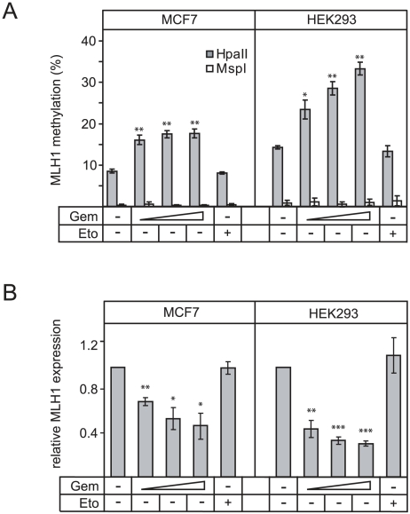 Figure 6. Gemcitabine induces hypermethylation and silencing of MLH1.(A) Methylation sensitive PCR analyzing MLH1 promoter methylation state in MCF7 or HEK293 cells. Cells were treated as indicated with increasing concentrations of gemcitabine (Gem, 33–134 nM) or etoposide (Eto, 43 nM) as control. HpaII restriction is methylation sensitive and allows the quantification of the MLH1 methylation state. As control, samples were also treated with the methylation insensitive isoschizomer MspI. Error bars represent the standard deviation of three biological replicates. Significance was assessed via unpaired Student's t-test using the untreated sample as reference: * = p<0.05; ** = p<0.01. (B) Cells were treated as in (A). Relative expression of MLH1 normalized to GAPDH was monitored by qPCR. Error bars represent the standard deviation of three biological replicates. Significance was assessed via unpaired Student's t-test using the untreated sample as reference: * = p<0.05; ** = p<0.01; *** = p<0.001.