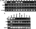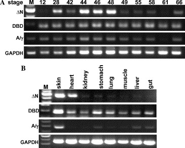 Fig. 2. Analysis of the Xenopus p51/p63 gene expression through the late phase of development and in adult tissues. (A) Temporal changes in the p51/p63 gene expression through stages 12–66. RT-PCR with the ΔN-, DBD-, and A/γ-specific primers produced 463, 185, and 292 bp products, respectively. An equal amount of total RNA obtained at each point was examined. GAPDH mRNA was analyzed as a control. A 100-bp ladder was loaded in slot M for identification of the amplified products. (B) p51/p63 expression profile in adult frog tissues.