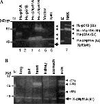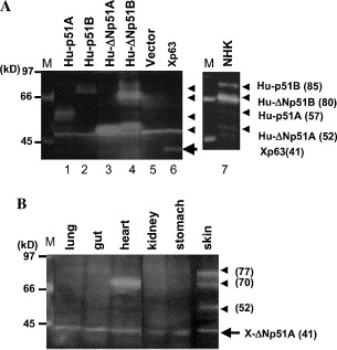 Fig. 3. Detection of the Xenopus p51/p63 proteins by Western blotting. (A) HeLa cells transfected with human and Xenopus p51/p63 expression vectors. Cells transfected with Hu-p51A/TAp63γ (lane 1), Hu-p51B/TAp63α (lane 2), Hu-ΔNp51A/ΔNp63γ (lane 3), Hu-ΔNp51B/ΔNp63α (lane 4), and Xenopus p51/p63 (lane 6) expression vectors were analyzed. Control experiment with the vector-only plasmid is shown in lane 5. The human and Xenopus proteins were indicated by arrowheads and arrow, respectively. Apparent molecular masses are denoted in kDa in parentheses. An NHK lysate was also analyzed in lane 7. Size markers in lane M are indicated with bars. (B) Proteins in adult frog tissues. Arrow indicates ΔN-A/γ type Xenopus p51/p63 (41 kDa) found in skin, lung, gut, heart, kidney, and stomach. The 77, 70, and 52 kDa proteins found in the skin extract are indicated by arrowheads. The 70 kDa protein was also detectable in the heart.
