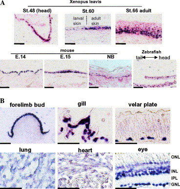 Fig. 4. Immunohistochemical analysis of larval tissues for the p51/p63 proteins. (A) Localization of p51/p63-expressing cell in basal layer of epidermis. Xenopus, mouse, and zebrafish skin sections were stained with 4A4 and Nuclear Fast Red (Biomedia). Xenopus skin sections at indicated stages (st) and mouse sections on embryonic days (E) and that of newborn (NB) are shown. The frog sample at stage 60 displays the junction between the larval skin and the adult-type skin. Adult zebrafish epidermis with scales is shown. Bars indicate 50 μm. (B) Localization of the p51/p63 proteins in the frog tissues at stage 48. Tissues and organs are indicated. ONL, INL, IPL, and GNL in the retina indicate outer nuclear layer, inner nuclear layer, inner plexiform layer, and ganglion cell layer, respectively. The forelimb bud, gill, and velar plate sections were stained with 4A4 only.