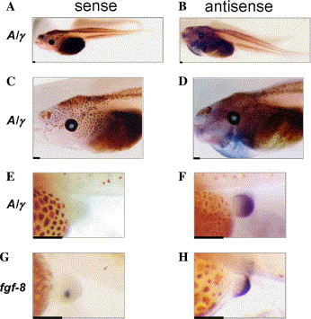 Fig. 5. Whole mount in situ hybridization with the larvae at stage 46. Tadpoles at stage 46 were examined for expression of p51/p63 and fgf-8. Results of the hybridization with A/γ (AâF) and fgf-8 (G,H) probes with sense (A, C, E, and G) and antisense (B, D, F, and H) sequences are shown. (C,D) This show magnified views of the anterior portions of the animals in (A,B), respectively. (E,F) It show lateral views of the hindlimb buds of the samples in (A,B). Bar indicates 0.4 mm.