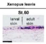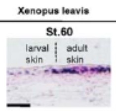 Xenopus skin sections at prometamorphosis NF stage 60, assayed via IHC (stained with 4A4 and Nuclear Fast Red) showing tp63 proteins localised in basal layer of epidermis in adjacent larval and adult skin areas.