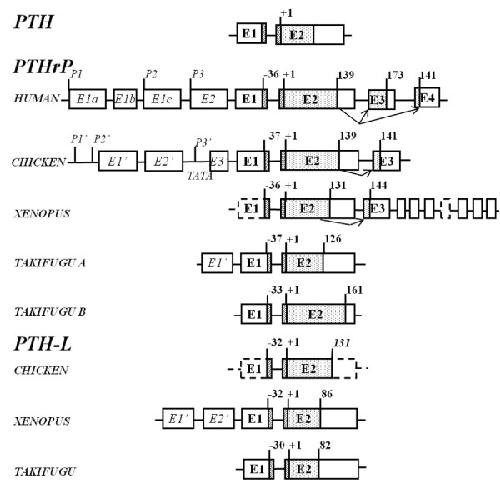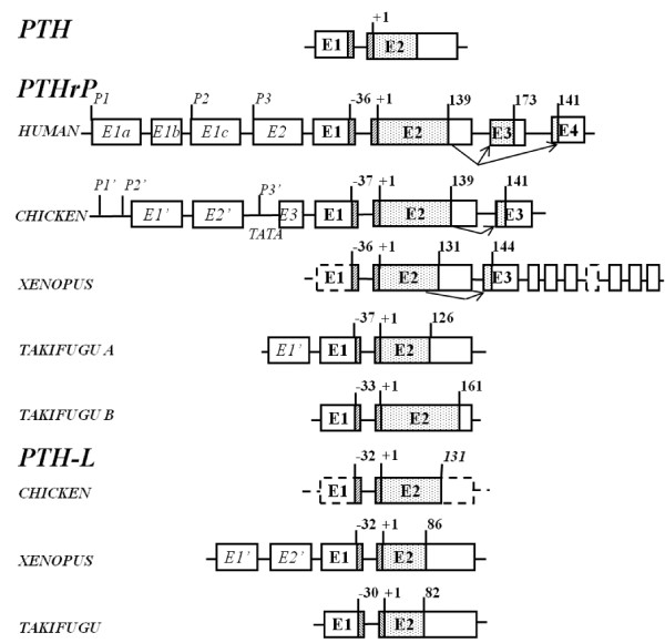 Figure 2. Gene organization of the vertebrate PTH-like family members. Exons are represented by boxes and lines indicate introns. Coding (E1 to E4) and non-coding (E1' to E'3) exons are numbered and annotated in bold and italics, respectively. Dotted-filled boxes represent the mature coding regions and black lines box the signal peptide sequence. Arrows represent alternative splice isoforms identified in Xenopus and chicken and previously reported in human. The general organization of the conserved vertebrate PTH gene structure is represented and the size of vertebrate PTHrP and PTH-L precursors is given (amino acids). The length of the chicken PTH-L precursor was predicted in silico and is indicated in italics. Dashed lines indicate incomplete structures that were not confirmed in silico or amplified by RT-PCR. The start of the mature peptide (+1) and the size of the signal peptide for all vertebrate PTH family members is indicated. The localization of the human PTHrP promoter regions (P1, P2 and P3) and the chicken PTHrP putative promoter sites (P1', P2' and P3') and TATA box consensus sequence within the region of P3' are shown. The figure is not drawn to scale and Takifugu A structure was taken from Power et al. [42].