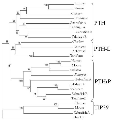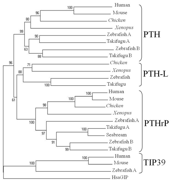 Figure 3. Consensus phylogenetic tree of Xenopus and chicken PTH family members using the Neighbor Joining method [60]and 1000 bootstraps replicates with the complete amino acid precursor sequence in Mega3.1 software [61]with the settings pairwise deletion, p-distance model and 222 informative sites. Xenopus and chicken PTH family members are in italics and the sequence of human GIP (HsaGIP, NP_004114) was used as outgroup. Human (NP_848544), mouse (NP_444486) and zebrafish (NP_991140) TIP39 mature protein sequences were included for comparative purposes. The accession numbers of other sequences utilized for tree construction are indicated in Figure 1 and seabream PTHrP is AAF79073.