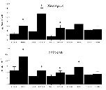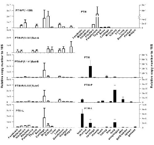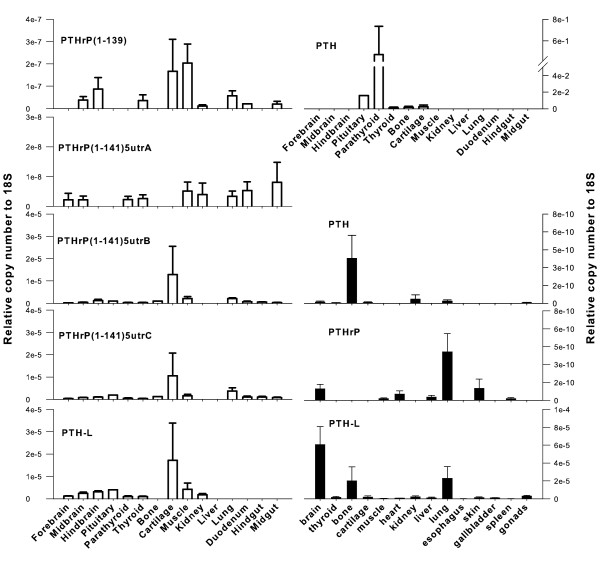 Figure 5. Expression of chicken (open bars) and Xenopus (closed bars) PTH family genes as determined by q-PCR. Gene specific primers were used to amplify PTH and PTH-L transcripts and PTHrP spliced isoforms from several tissues. The number of amplified transcripts is presented in relation to 18S copy number and data is presented as mean ± S.E. (n = 2 to 3 for Xenopus and n = 3 for chicken except for pituitary where n = 1).