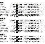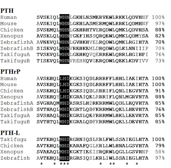 Figure 1. Multiple sequence alignment of the Xenopus and chicken 1-34 PTH family members mature peptide N-terminal region with teleost (Takifugu and zebrafish) and mammals (human and mouse). Conserved amino acid positions identified in all vertebrates are indicated by * and percentage of sequence similarity in comparison with human PTH and PTHrP and Takifugu PTH-L is given. The typical three amino acid motifs characteristic of each PTH family member in positions 8 to 10 are indicated in black. % similarity to first sequence is indicated on the right. Accession number of the sequences used were: Human (PTH, AAH96144.1; PTHrP, AAA60216); Mouse (PTH, NP_065648; PTHrP, CAC39218.1); Zebrafish (PTHA, NP_998115.1; PTHB, NP_998114.1; PTHrPA, AAY87956.1; PTHrPB, AAY87957.1; PTH-L, CU856139); Takifugu (PTHA, CAG26460.1; PTHB, CAG26461.1; PTHrPA, CAB94712.1; PTHrPB, CAG26459.2; PTH-L, CAG26462.1).