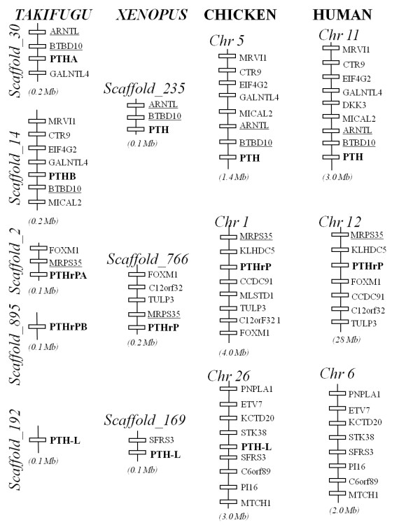 Figure 4. Short-range gene linkage comparisons of the PTH family members in the Takifugu, Xenopus, chicken and human genomes. Genes are represented by closed boxes and the size of the chromosome region analysed is given underneath. Genes were named using HUGO and lines indicate chromosome/scaffold segments. The vertebrate PTH family members are in bold and conserved flanking genes identified within the homologue regions are underlined. The PTH gene is localized in Xenopus scaffold_235 and in chicken chromosome 5 and two conserved genes ARNTL and BTBD10 were identified. The Xenopus and chicken PTHrP maps to scaffold_766 and chromosome 1, respectively and the gene MRPS35 was found in close proximity in all vertebrate regions analysed. PTH-L and SFRS3 genes map to Xenopus scaffold_169 and to chicken chromosome 26. SFRS3 was not linked to Takifugu PTH-L and is present on human chromosome 6 which lacks PTH-L. For simplicity, only genes with correspondence across species are represented. The figure is not drawn to scale.