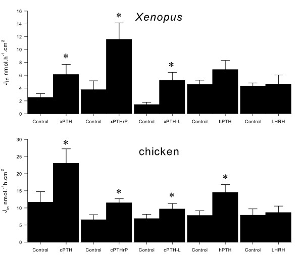Figure 6. Calcium fluxes (water to blood side) in Xenopus abdominal skin and chicken 16 to 18 day old embryo CAM (shell to embryo side) after the addition of 10 nM, N-terminal (1-34) PTH, PTHrP and PTH-L to the basolateral membrane site. Human PTH (1-34) and salmon Luteinizing hormone-releasing hormone (LHRH) were used as positive and negative controls respectively. Results are shown as mean ± SEM and the * indicates statistical significance compared to control (time 0) (p < 0.05).