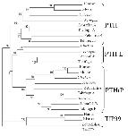???displayArticle.abstract??? Parathyroid hormone (PTH) and PTH-related peptide (PTHrP) belong to a family of endocrine factors that share a highly conserved N-terminal region (amino acids 1-34) and play key roles in calcium homeostasis, bone formation and skeletal development. Recently, PTH-like peptide (PTH-L) was identified in teleost fish raising questions about the evolution of these proteins. Although PTH and PTHrP have been intensively studied in mammals their function in other vertebrates is poorly documented. Amphibians and birds occupy unique phylogenetic positions, the former at the transition of aquatic to terrestrial life and the latter at the transition to homeothermy. Moreover, both organisms have characteristics indicative of a complex system in calcium regulation. This study investigated PTH family evolution in vertebrates with special emphasis on Xenopus and chicken. The PTH-L gene is present throughout the vertebrates with the exception of placental mammals. Gene structure of PTH and PTH-L seems to be conserved in vertebrates while PTHrP gene structure is divergent and has acquired new exons and alternative promoters. Splice variants of PTHrP and PTH-L are common in Xenopus and chicken and transcripts of the former have a widespread tissue distribution, although PTH-L is more restricted. PTH is widely expressed in fish tissue but from Xenopus to mammals becomes largely restricted to the parathyroid gland. The N-terminal (1-34) region of PTH, PTHrP and PTH-L in Xenopus and chicken share high sequence conservation and the capacity to modify calcium fluxes across epithelia suggesting a conserved role in calcium metabolism possibly via similar receptors. The parathyroid hormone family contains 3 principal members, PTH, PTHrP and the recently identified PTH-L. In teleosts there are 5 genes which encode PTHrP (2), PTH (2) and PTH-L and in tetrapods there are 3 genes (PTHrP, PTH and PTH-L), the exception is placental mammals which have 2 genes and lack PTH-L. It is hypothesized that genes of the PTH family appeared at approximately the same time during the vertebrate radiation and evolved via gene duplication/deletion events. PTH-L was lost from the genome of eutherian mammals and PTH, which has a paracrine distribution in lower vertebrates, became the product of a specific endocrine tissue in Amphibia, the parathyroid gland. The PTHrP gene organisation diverged and became more complex in vertebrates and retained its widespread tissue distribution which is congruent with its paracrine nature.