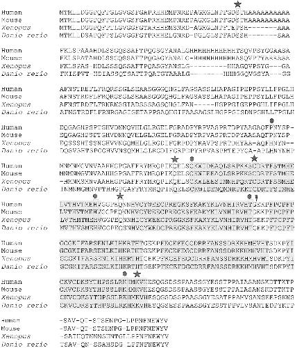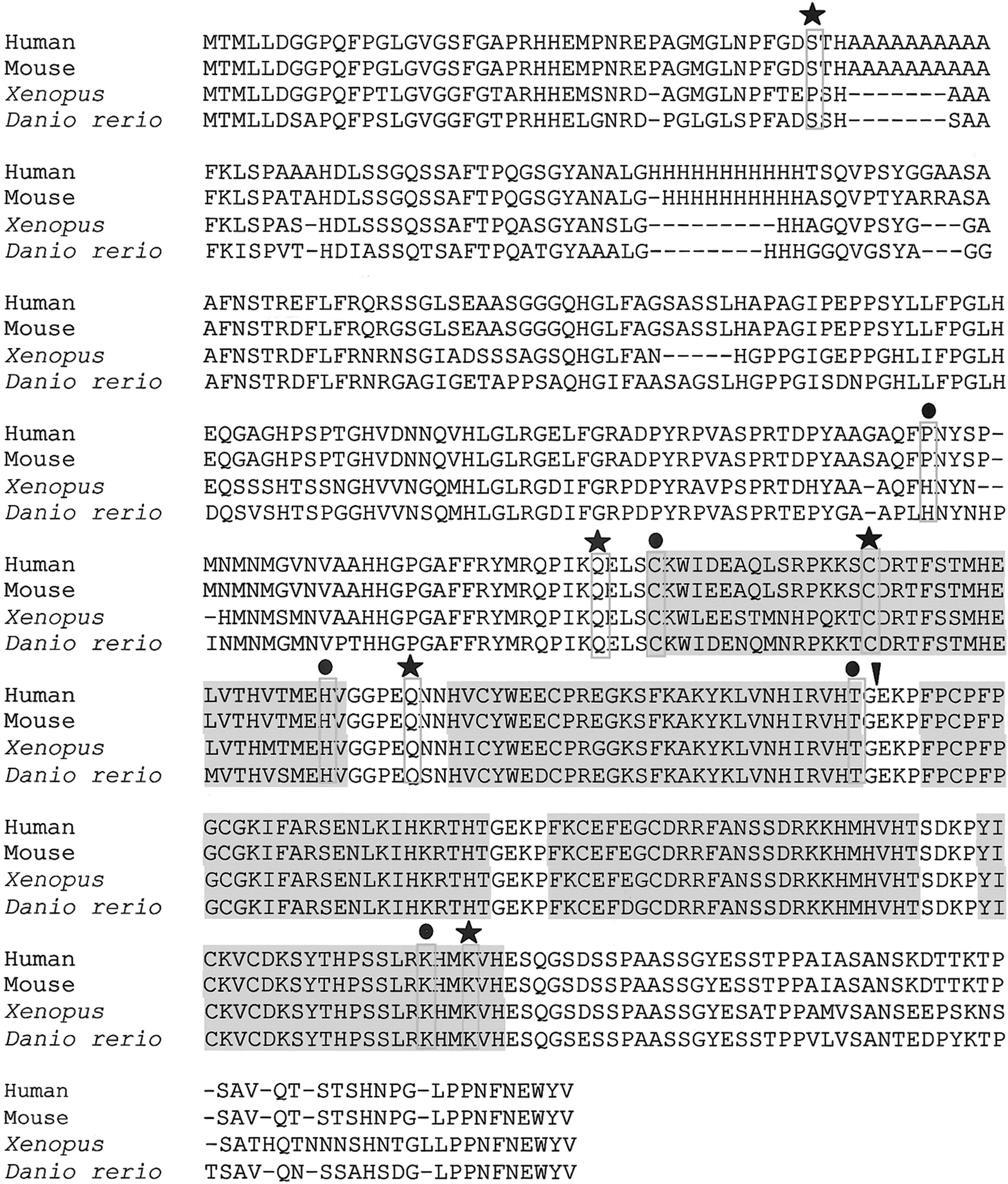 Figure 1. Conservation of ZIC3 sequence and location of all known mutations. The five C2H2 zinc finger domains are shaded. The amino acid position for each mutation is boxed. Symbols above each box signify the type of mutation: circle (•) = missense; star (★) = nonsense; downward arrowhead (▾) = insertion.