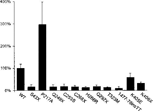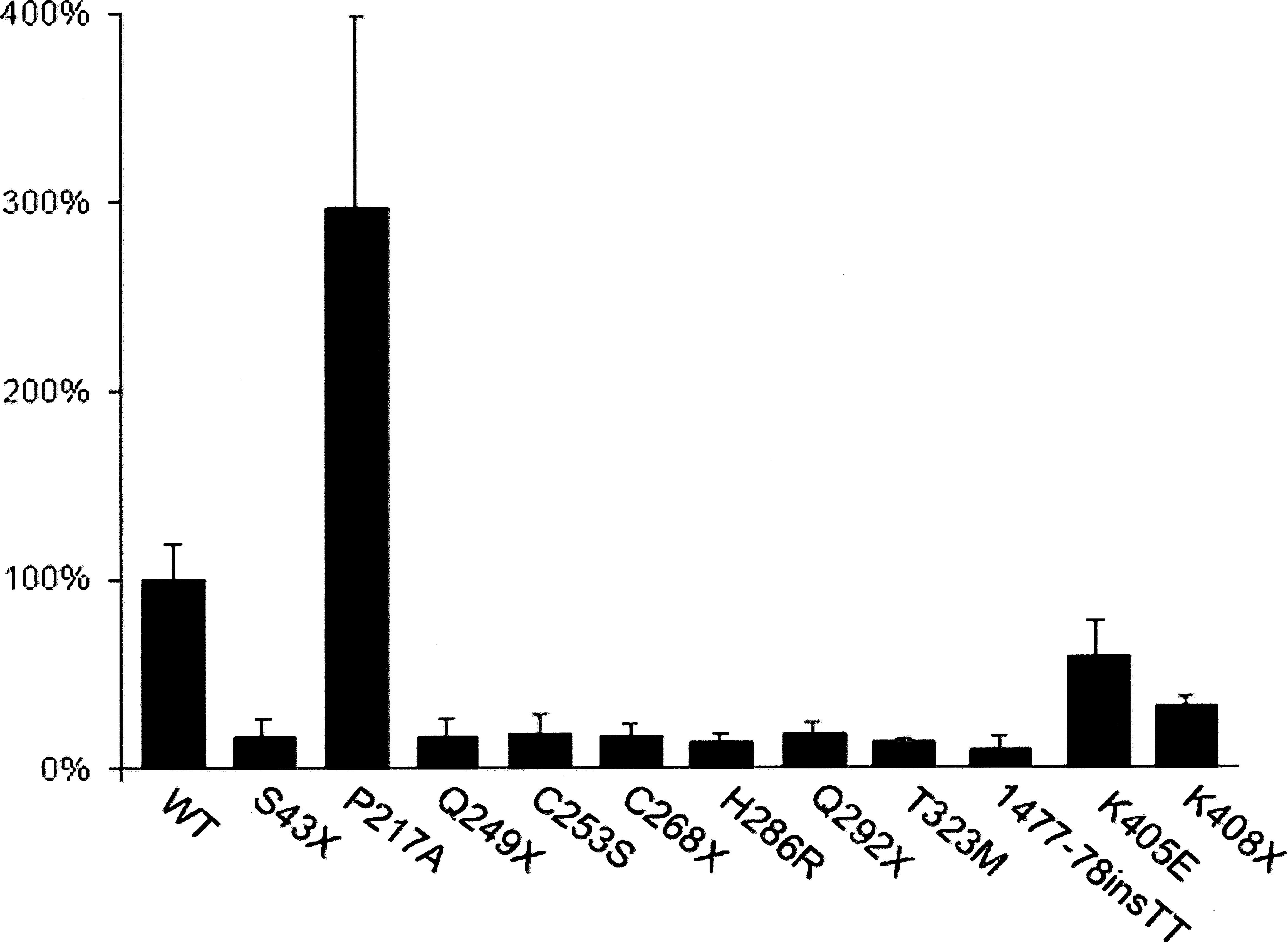 Figure 3. ZIC3 mutations alter transactivation of an SV40 luciferase reporter gene. The luciferase activity of an SV40-luciferase construct cotransfected with HA-ZIC3 wild-type (WT) or mutant constructs is indicated. The specific HA-ZIC3 construct used for cotransfection is shown below each bar. Luciferase activities were measured relative to a promoterless control plasmid and the mean fold-activation as compared with that of the wild type is expressed as a percentage. Each bar represents a minimum of four separate experiments. Vertical lines indicate the standard deviation for each set of experiments.