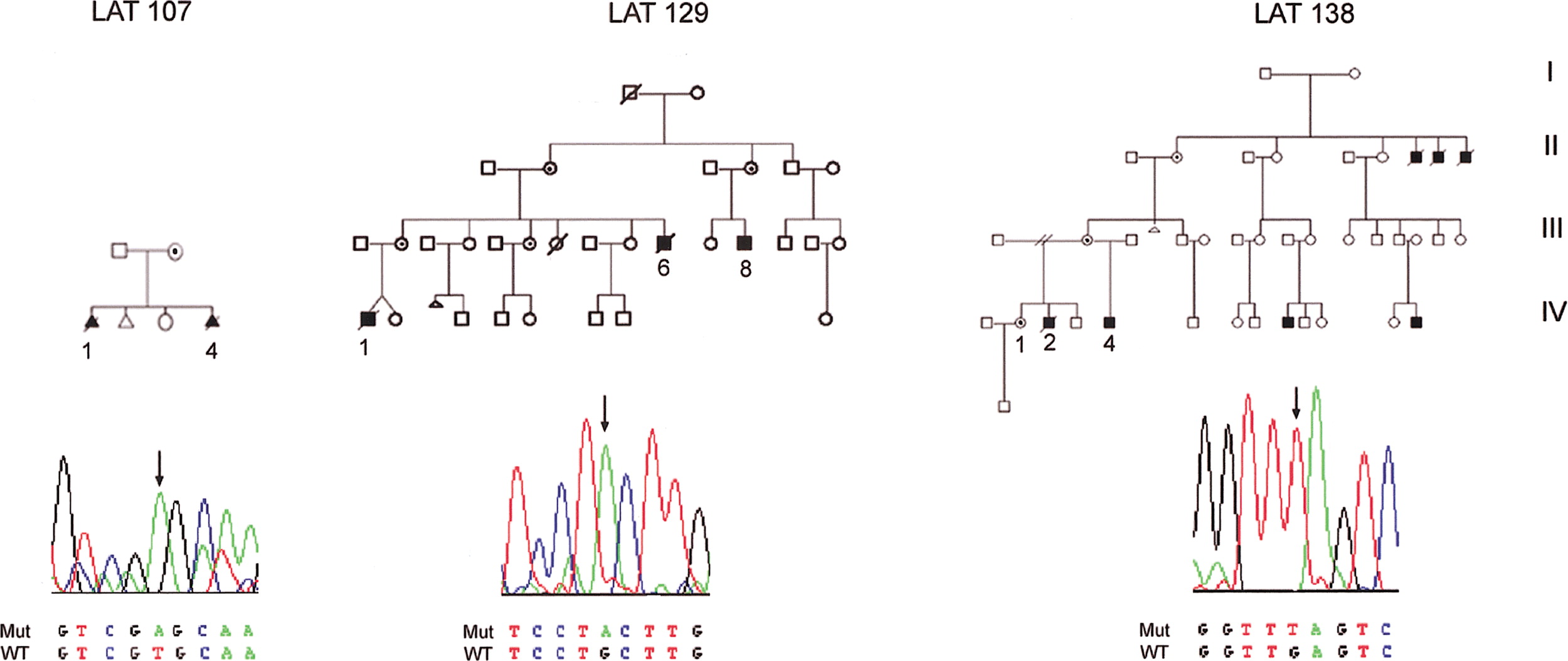Figure 2. ZIC3 mutations in familial heterotaxy. Sequence traces for the hemizygous proband are shown below each pedigree. Sequences shown for LAT 129 and LAT 138 represent the reverse complement. The phenotypes of affected individuals for whom data are available are shown in table 3.