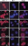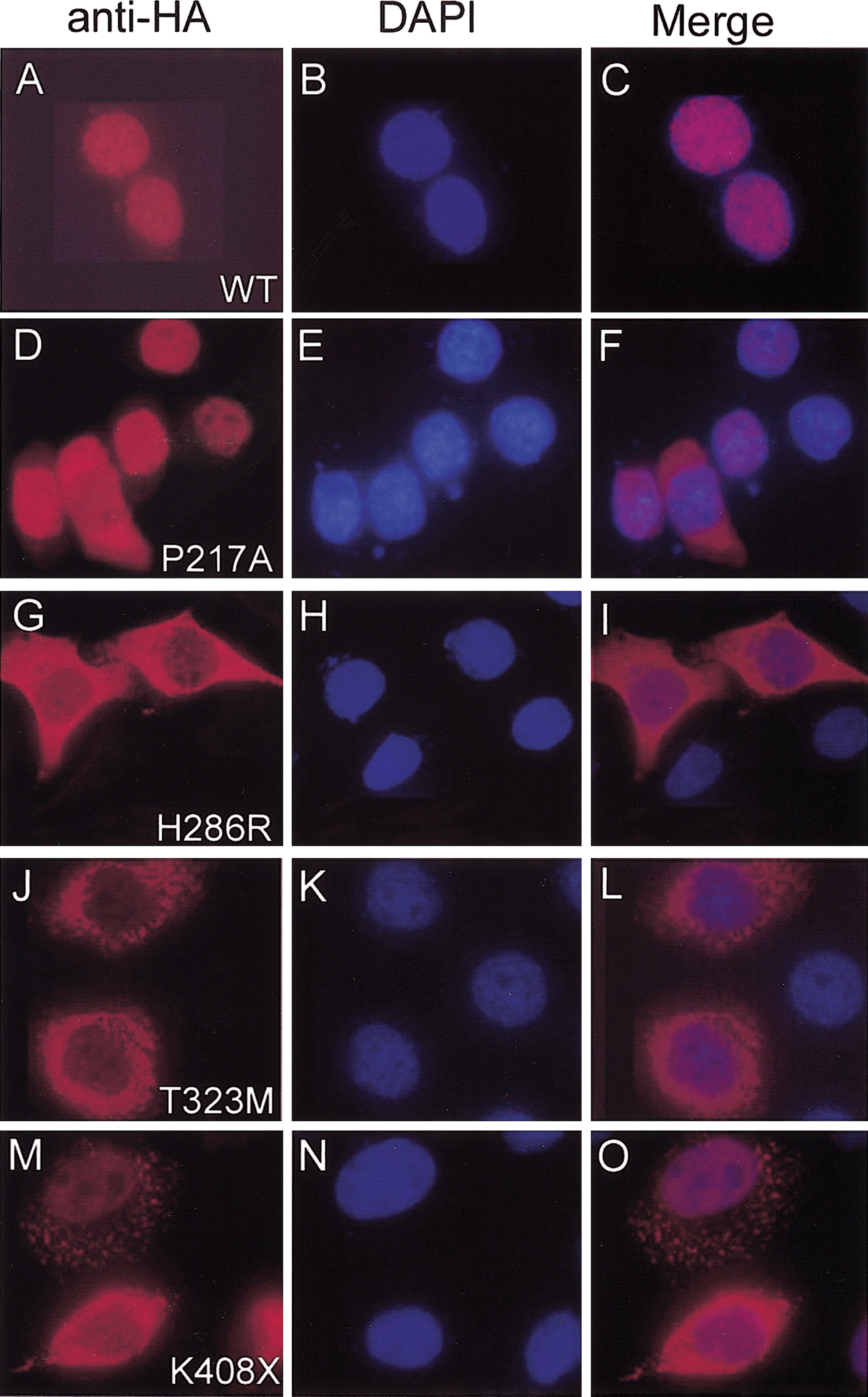 Figure 4. Immunofluorescent subcellular localization of ZIC3. For each construct, anti-HA (panels A, D, G, J, and M) and DAPI (panels B, E, H, K, and N) staining are shown individually and merged (panels C, F, I, L, and O). The wild-type construct is located in the nucleus (panels A–C); the missense mutation construct P217A is primarily nuclear (panels D–F), whereas H286R is located in the cytoplasm (panels G–I). T323M (panels J–L) and K408X (panels M–O) show evidence of cytoplasmic stippling.