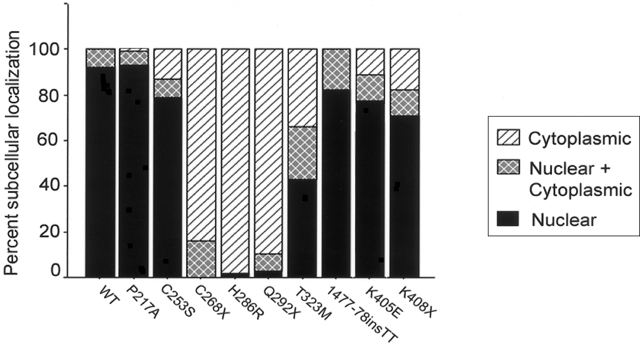 Figure 5. Mutations in ZIC3 alter subcellular localization. The subcellular localization of anti-HA staining is shown graphically for each construct. Nuclear, nuclear and cytoplasmic, and cytoplasmic staining are indicated as percentages.