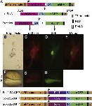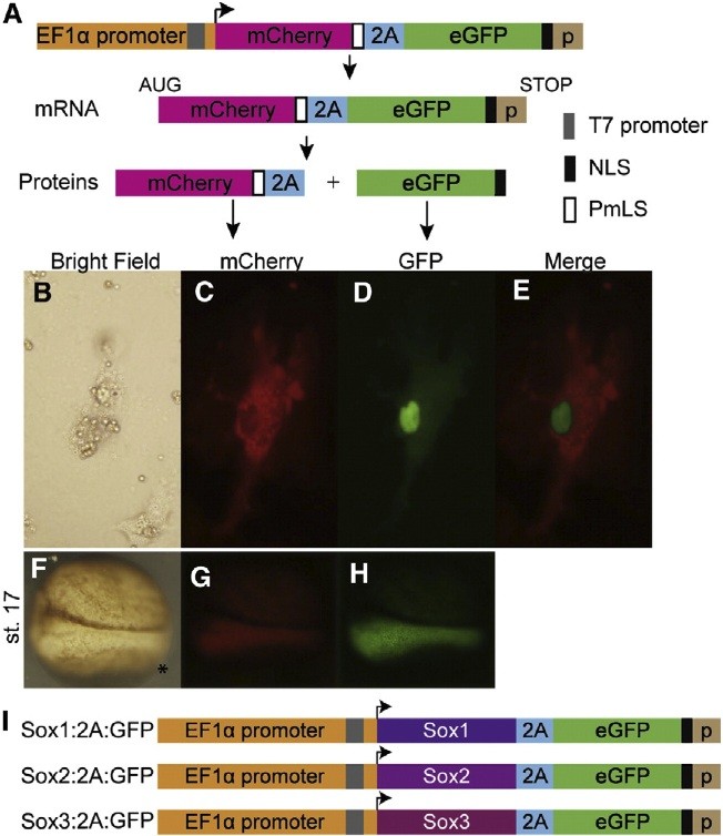 Fig. 7. A constitutively-active bicistronic vector generates two proteins from a single transcript in Xenopus. (A) A diagram for the bicistronic 2A vector shows that a single transcript forms two proteins. mCherry (pink) contains a plasma membrane localization signal (PmLS, white) and GFP contains nuclear localization signal (NLS, black). (B) Xenopus embryonic fibroblast cell transfected with the bicistronic system with vector in A. mCherry is in the plasma membrane (C) and GFP in the nucleus (D). (F) In vitro transcribed 2A vector mRNA injected into half of the two-cell stage embryo is visible under a dissecting fluorescent microscope in a neurula stage 17 embryo. (I) Bicistronic constructs used for the generation of transgenic embryos. Each SoxB1 (purple) is upstream of the 18 amino acid 2A viral sequence (blue) followed by nuclear localizing GFP (green) and poly-A signal (brown) and expression is controlled by the constitutively-active EFlα promoter (orange). Asterisk marks injected side. Diagram not to scale. |