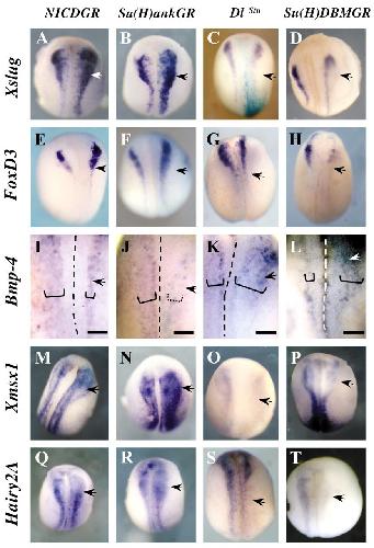 Fig. 3. Notch signaling is required for neural crest specification. Two-cell embryos were injected in one blastomere with 0.7 ng of NICDGR (A,E,I,M,Q), 0.7 ng of Su(H)ankGR (B,F,J,N,R), 1 ng of DeltaStu (C,G,K,O,S) or 0.25 ng of Su(H)DBMGR (D,H,L,P,T) mRNA, and the inducible constructs were activated at stage 12. NICDGR and Su(H)ankGR activate Notch signalling, and DeltaStu and Su(H)DBMGR inhibit Notch signalling. The expression of Xslug, Foxd3, Bmp4, Xmsx1 and Hairy2A was analyzed at stage 17 or 18 by in situ hybridization, and the injected sides were visualized by alkaline phosphatase-mediated FITC immunodetection. The injected side is labeled with an arrow and all embryos are presented dorsally with the anterior to the top. (A,B,E,F) Note the expansion of Xslug (A,B) and Foxd3 (E,F) expression on the injected side after activation of Notch signaling. (C,D,G,H) Note the inhibition in Xslug (C,D) and Foxd3 (G,H) expression on the injected side, after inhibition of Notch signaling. (I-L) The domain of expression of Bmp4 is highlighted in the neural folds by the brackets. Scale bar: 80 μm. Note the reduced expression domain after Notch activation (I,J), and the expansion and increase in the intensity of Bmp4 expression on the injected side after Notch inhibition (K,L). (M-P) Expression of Xmsx1. Note the expansion in the Xmsx1 expression domain after Notch activation (M,N) and the reduction of Xmsx1 expression on the injected side after Notch inhibition (O,P). (Q-T) Hairy2A expression. Note the expansion in Hairy2A expression in the injected side after Notch activation (Q,R) and the decrease in Hairy2A expression on the injected side after Notch inhibition (S,T). Each experiment was performed at least twice with a minimum of 45 embryos. The effect seen in each experiment was observed in at least 70% of embryos.