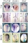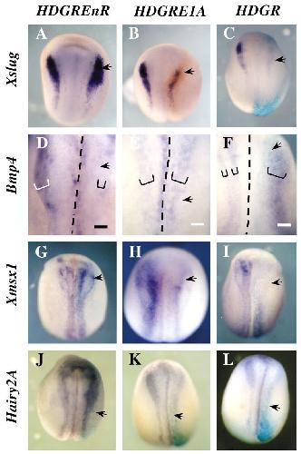 Fig. 5. Xiro1 participates in the induction of neural crest cells. Two-cell embryos were injected in one blastomere with 1 ng of the inducible forms of a repressor of Xiro1 (HDGREnR) (A,D,G,J), an activator form of Xiro1 (HDGRE1A) (B,E,H,K), or with a dominant-negative form of Xiro1 (HDGR) (C,F,I,L). The embryos were treated with dexomethasone at stage 12, and the expression of Xslug, Bmp4, Xmsx1 and Hairy2A was analyzed by in situ hybridization. The injected side was visualized by Myc inmunostaining, or alkaline phosphatase-mediated FITC inmunostaining, and is indicated with an arrowhead. (A-C) Xslug expression. (A) An expansion of the Xslug expressing neural crest domain is observed. (B,C) Xslug expression is reduced on the injected side. (D-F) Bmp4 expression. (D) A repression of Bmp4 in the neural fold domain is indicated by the bracket. (E,F) The levels of Bmp4 transcripts are augmented on the injected side and an expansion in the expression domain is also observed. Note that in F, the expression indicated by two small brackets on the uninjected side is transformed into a single big bracket on the injected side. Scale bar: 85 μm. (G-I) Xmsx1 expression. (G) Note the expanded Xmsx1 expression domain. (H,I) A reduction in the expression of Xmsx1 can be seen in the neural fold region. (J-L) Hairy2A expression. (J) An expanded domain of Hairy2A expression is observed in the neural fold, whereas Hairy2A expression is inhibited by the injection of HDGRE1A and HDGR (K,L). Each experiment was performed at least twice with a minimum of 42 embryos. The effect seen in each experiment was observed in at least 65% of embryos.