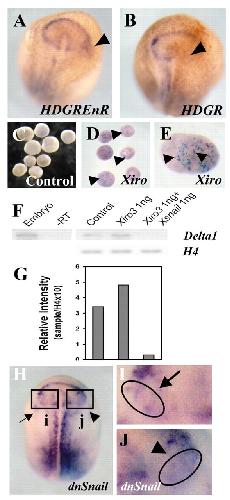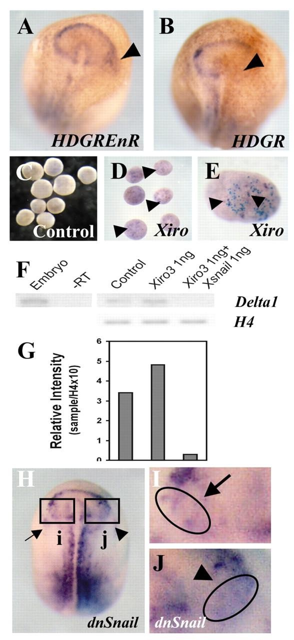 Fig. 7. Delta1 expression is upregulated by Xiro1 and down regulated by Snail. (A,B) Two-cell embryos were injected in one blastomere with 1 ng HDGREnR (A) or with 1 ng HDGR (B) mRNA. The embryos were treated with dexomethasone at stage 12 and the expression of Delta1 was analyzed by in situ hybridization at stage 17. The injected side was visualized by alkaline phosphatase-mediated FITC immunodetection. (A) HDGREnR produces a moderate expansion of Delta1 expression in the neural crest region (arrowhead), whereas HDGR leads to a complete inhibition of Delta1 expression in the crest region (B; arrowhead). (C-E) Animal caps taken from stage 9 embryos were cultured until the equivalent of stage 18, and the expression of Delta1 was analyzed by in situ hybridization. (C) In control animal caps, no expression of Delta1 could be detected. (D,E) In animal caps taken from embryos injected with 1 ng Xiro3 mRNA, Delta1 expression was observed in 87% of the caps (n=57). (E) Higher magnification of the animal cap shown in D. (F) RT-PCR to analyze Delta1 and H4 mRNA. Arrowheads in D,E indicate Delta1-expressing cells. Left panel, control embryo and PCR in the absence of reverse transcriptase; right panel, mRNA taken from a control animal cap, a cap injected with 1 ng Xiro3 mRNA, or a cap co-injected with 1 ng Xiro3 mRNA and 0.7 ng Xsnail mRNA. (G) Quantification of data shown above in F. Note the increase in Delta1 mRNA produced by Xiro3, and the complete inhibition produced by Xsnail. (H-J) Two-cell embryos were injected in one blastomere with 0.7 ng dnSnail mRNA. The embryos were treated with dexomethasone at stage 12, and the expression of Delta1 was analyzed by in situ hybridization at stage 17. The injected side was visualized by alkaline phosphatase-mediated FITC inmunodetection. (H) Delta1 expression is upregulated in the neural crest region. (I,J) Higher magnification of the neural crest region indicated by the box in H, where the staining was stronger on the injected (J) than on the uninjected side (I). Arrow, uninjected side; arrowhead, injected side. Each experiment was performed at least twice with a minimum of 52 embryos. The effect seen in each experiment was observed in at least 65% of embryos.