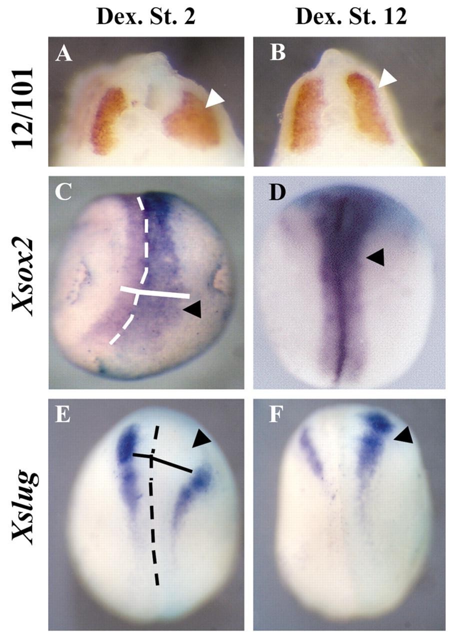 Fig. 2. Activation of Notch signaling on mesoderm, neural plate and neural crest development. Two-cell stage embryos were injected with NICDGR mRNA in one blastomere, treated with dexomethasone either directly after the injection (A,C,E) or at stage 12 (B,D,F), and cultured until stage 25 (A,B) or stage 18-19 (C-F). Subsequently, the expression of distinct markers was analyzed. The side of the injection is indicated with an arrowhead. (A,B) Immunostaining of somites with the 12/101 antiserum. Note the expansion of the somite in the injected side following early activation (A), and the normal morphology after late activation (B). Following activation at stage 2, 78% of embryos demonstrated somite expansion (n=70), whereas activation at stage 12 did not produce any expansion of the somites (0%; n=87). (C,D) In situ hybridization to visualize Sox2 transcripts in the neural plate. Activation at stage 2 (C) leads to an expansion of the neural plate (65% of embryos with expanded neural plate; n=83), whereas activation at stage 12 (D) produces no effect on the neural plate (100% normal; n=92). (E,F) In situ hybridization to visualize Xslug transcripts in the cephalic neural crest. Activation at stage 2 (E) produces an inhibition in the expression of this neural crest marker (58% of inhibition; n=102), whereas activation at stage 12 (F) produces an expansion of Xslug expression (expanded in 75% of embryos; n=152).