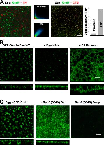 Figure 2. Orai1 internalization endocytic pathway. (A) Oocytes expressing GFP-Orai1 were stained with 125 µg/ml Alexa Flour 633 transferrin (Trf) or 5 µg/ml Alexa Fluor 555 CTB at the GVBD stage and allowed to complete maturation. Colocalization efficiency was measured using ZEN2008 (n = 14). Error bars indicate mean ± SEM. (B) Wild-type dynamin (WT Dyn) or the K44A mutant (30 ng/cell) were injected in GFP-Orai1âexpressing cells and allowed 24 h to express before inducing maturation. C3 exoenzyme (1.7 ng/cell) was injected into GFP-Orai1âexpressing cells 1 h before maturation. Images are from a focal plane â¼2-µm deep from the cell surface. Orthogonal sections are also shown. (A and B) Bars, 10 µm. (C) Oocytes were injected with GFP-Orai1 alone or with 20 ng of the dominant-negative Rab5 (S34N) and then matured. Images show a deep (â¼2 µm into the cell) focal plane (left) or the cell surface as indicated, with the corresponding orthogonal sections. Bar, 5 µm.