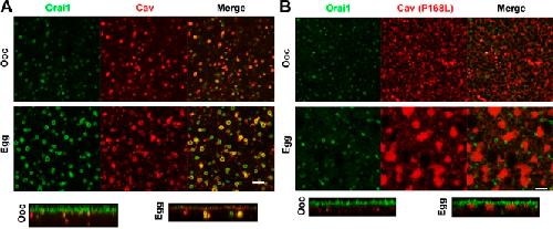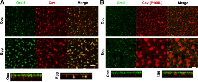 Figure 5. Cav is required for Orai1 internalization. (A) 10 ng GFP-Orai1– and mCherry-Cav–expressing oocytes and eggs. Images are ∼2-µm deep into the cell. Orthogonal sections are also shown. (B) GFP-Orai1 was allowed to express and traffic normally for 24 h followed by expression of 10 ng of the dominant-negative Cav mutant P168L 24 h before maturation. Bars, 5 µm.