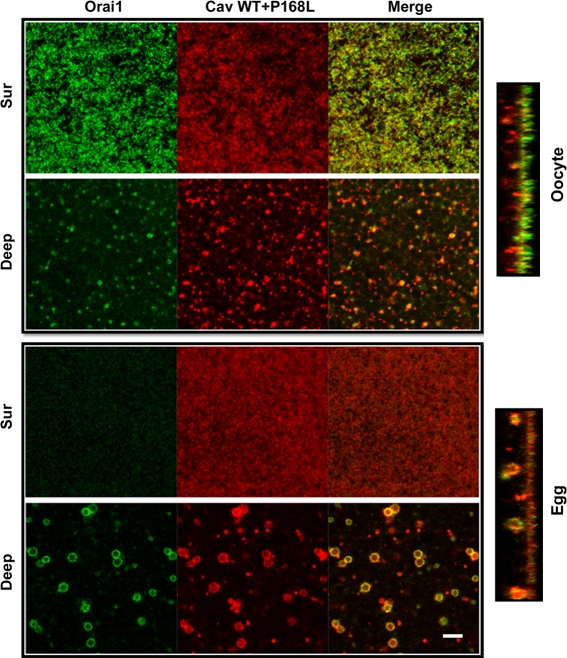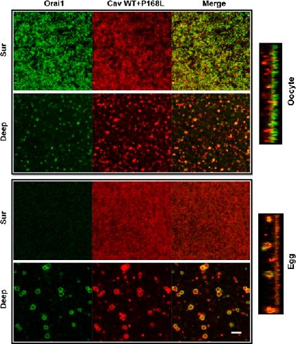 Figure 6. Wild-type Cav rescues Orai1 internalization inhibition with Cav P168L. Oocytes were injected with 2 ng GFP-Orai1, 10 ng Cherry-Cav (Ch-Cav) wild type (WT), and 10 ng Cherry-Cav-P168L, and then matured. Orthogonal sections and different focal plane images illustrate Orai1 and Cav distribution between the cell membrane (Sur) and endosomal compartment (Deep). Bar, 5 µm.