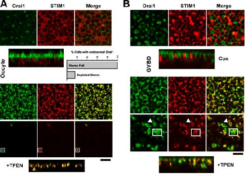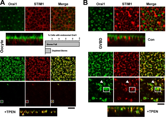 Figure 9. Endosomal Orai1 translocates to the cell membrane after store depletion. (A) Distribution of Orai1 and STIM1 in oocytes before and after store depletion with 5 mM TPEN, which results in coclustering of STIM1 and Orai1 at the plasma membrane–ER junction. In addition, rare coclustering events are detected deep in the cell (1.2 µm), as indicated by the boxes and matching white bar in the orthogonal section. Deep focal plane and orthogonal sections are shown. (B) Same experimental approach as in A except that images were taken at the GVBD stage of oocyte maturation. Store depletion (+TPEN) leads to Orai1–STIM1 coclustering at the cell membrane and deep in the cell at the endosome–ER interface (arrowheads and boxes). The position of the boxes is indicated by the bar in the orthogonal view. Bars, 5 µm.