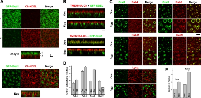 Figure 1. Orai1 subcellular distribution at rest and during meiosis. (A) Oocytes and eggs expressing GFP-Orai1 (2 ng RNA/cell) and the ER marker mCherry-KDEL (10 ng RNA/cell). Confocal images show two focal planes as indicated by the matching numbers (1 and 2) in the orthogonal section across the z-image stack. Bar, 3 µm. (B) Orthogonal sections from cells expressing 8 ng xTMEM16a-mCherry with either 5 ng GFP-KDEL or 2 ng GFP-Orai1. Bar, 3 µm. (C) Oocytes and eggs expressing GFP-Orai1 with endosome markers including RFP-Rab5, mCherry-tagged Rab4, Rab9, and Rab11 or stained with the lysosome marker LysoTracker. Bar, 5 µm. (D) Percentage of Orai1-positive pixels colocalizing with the Rabs (n = 10–15). (E) Equivalent endosome radius measured using MetaMorph (n = 9–13). Error bars indicate mean ± SEM.