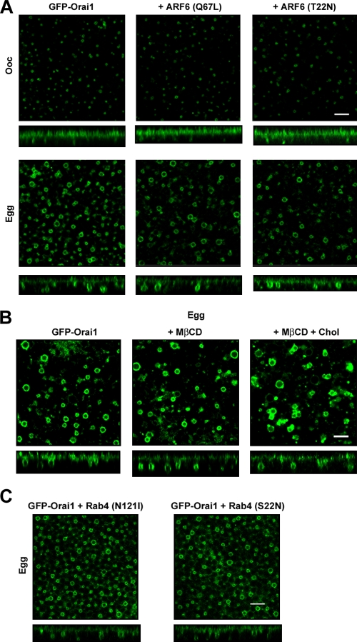 Figure 3. Orai1 internalization: ARF6, cholesterol, and Rab4. (A) Oocytes and eggs expressing 2 ng GFP-Orai1 alone or with 20 ng constitutively active ARF6 (Q67L) or 20 ng dominant-negative ARF6 (T22N). Orthogonal sections and deep-view images are shown. (A) GFP-Orai1–expressing oocytes were untreated, treated with 20 mM MβCD to deplete cholesterol, or treated with MβCD plus 5 mg/ml cholesterol for 9 h in Ringer, and then matured. (C) Orthogonal sections and deep-view images from eggs expressing 20 ng GFP-Orai1 and dominant-negative Rab4 mutants N121I or S22N. Bars, 5 µm.