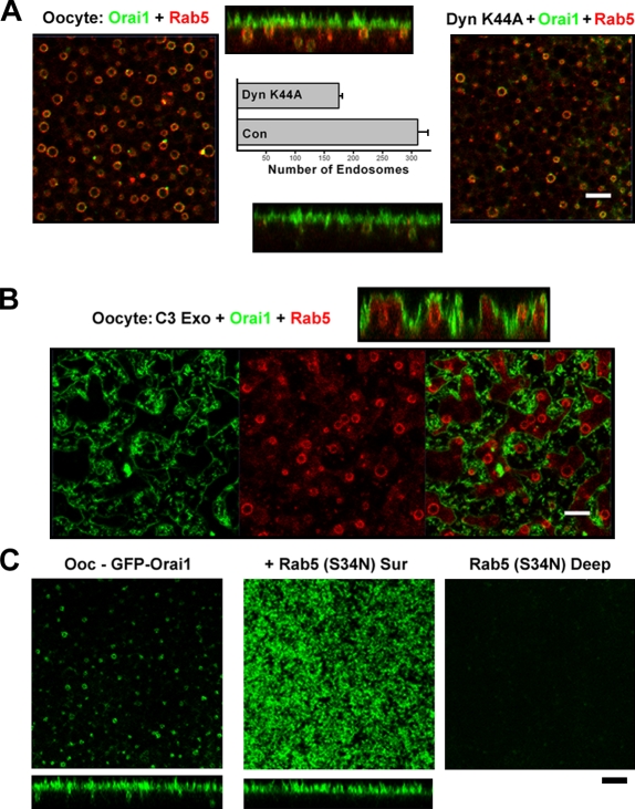 Figure 4. Orai1-recycling endocytic pathway. (A) Oocytes expressing 10 ng GFP-Orai1 and RFP-Rab5 were untreated or injected with dynamin (Dyn) K44A and allowed 24 h to express. Deep-view images and orthogonal sections are shown. The number of Rab5- and Orai1-positive endosomes was measured using MetaMorph (n = 9–19). Error bars indicate mean ± SEM. (B) C3 exoenzyme was injected into GFP-Orai1– and RFP-Rab5–expressing oocytes 2 h before imaging. (C) Images GFP-Orai1–injected or GFP-Orai1– and Rab5 (S34N)–coinjected oocytes. Bars, 5 µm.
