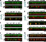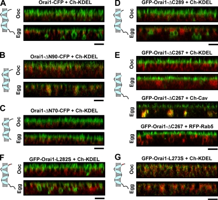 Figure 7. Domains involved in Orai1 trafficking. Orthogonal sections and cartoon representation for the different constructs as indicated. (A–C) Orai1 or N-terminal deletion mutants Orai1-ΔN90 and Orai1-ΔN70 tagged with CFP at the C terminus (5 ng RNA/cell) were coexpressed with Cherry-KDEL. (D) GFP-Orai1-ΔC289 (2 ng RNA/cell) is shown. (E) GFP-Orai1-ΔC267 alone or coexpressed with Cherry-Cav or RFP-Rab5. (F) GFP-Orai1-L282S traffics normally. (G) GFP-Orai1-L273S is trapped in the ER. Bars, 5 µm.