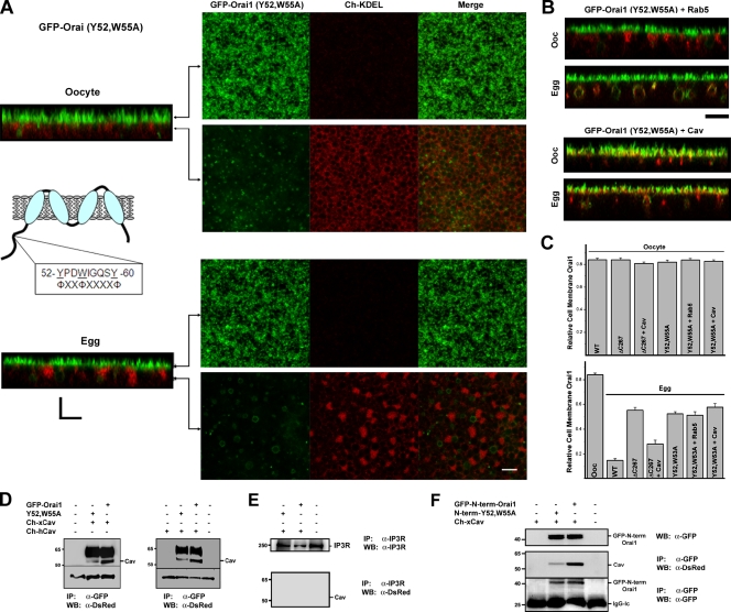 Figure 8. Identification of a Cav-binding site in the Orai1 N terminus. (A) The Cav consensus–binding site is illustrated in the cartoon. Cells expressing GFP-Orai1-Y52,W55A and Cherry-KDEL are shown. Planes at which the images were taken along the z stack are indicated in the orthogonal section. (B) Expression of Rab5 or Cav with Orai1-Y52,W55A does not restore its ability to internalize during meiosis. (C) Relative cell membrane Orai1 was measured as the percentage of GFP fluorescence signal on plasma membrane versus total (n = 9–38). WT, wild type. Error bars indicate mean ± SEM. (D) Orai1 was immunoprecipitated (IP) using anti-GFP antibodies from oocytes expressing 10 ng human (Ch-hCav) or Xenopus (Ch-xCav) Cav-1 with wild-type Orai1 or GFP-Orai1-Y52,W55A. Con indicates uninjected cells. Western blots (WB) were performed using anti-DsRed antibodies. The Cav band is indicated, also shown is a nonspecific band (∼33 kD) that reacts on the Western blot as a loading control. (E) Immunoprecipitation of the IP3 receptor (IP3R) as a nonspecific antigen does not pull down Cav, showing the specificity of the anti-GFP immunoprecipitation. (F) Oocytes were injected with GFP–N-term–Orai1, which contains residues 1–90 of Orai1. Cells were injected with wild-type GFP–N-term–Orai1 or a mutant with residues Y52 and W55 mutated to Ala (N-term–Y52,W55A). Immunoprecipitation was performed with an anti-GFP antibody and Western blots with either an anti-DsRed or anti-GFP as indicated. A Western blot of the different treatments is also shown (top). (D and F) Black lines indicate that intervening lanes have been spliced out. Bars, 5 µm.