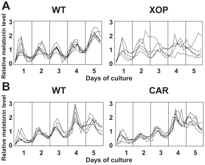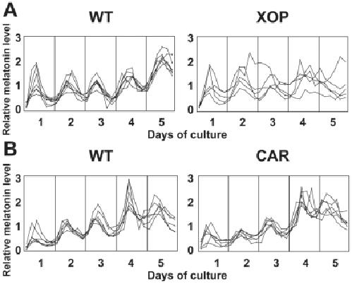 Figure 2. Melatonin release from the XOP-XCLΔQ-GFP and the CAR-XCLΔQ-GFP transgenic eyecups and wild-type controls.Each pair of eyecups was prepared from individual tadpoles and flow-through culture was performed for 5 days. Media fractions were collected every four hours, and assayed for melatonin by RIA. Each line represents melatonin release from a pair of eyecups. A. Melatonin release rhythms in the individual XOP-XCLΔQ-GFP eyecups (n = 5) and wild-type controls (n = 7). As compared to the wild-type eyes that demonstrate melatonin release in a circadian manner for five days, the majority of the transgenic eyes do not show significant circadian melatonin rhythmicity. B. Melatonin rhythms in the CAR-XCLΔQ-GFP (n = 6) and wild-type eyecups (n = 6). With some exceptions, eyecups release melatonin in a circadian manner.
