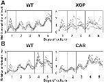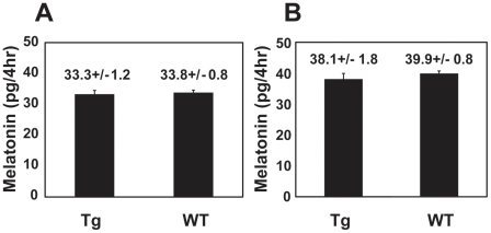 Figure 3. Total melatonin levels of the transgenic eyes and wild-type controls were comparable.Average of all fractions from the transgenic and wild-type eyes was calculated for the two different genotypes (XOP and CAR). Values on the figure are average melatonin content (picograms per 4hr) +/− SEM. A. The XOP transgenic (n = 25) vs. wild-type eyes (n = 37). B. The CAR transgenic (n = 17) vs. wild-type eyes (n = 73).