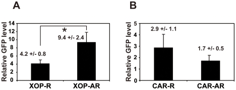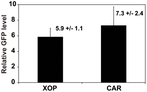 Figure 4. Expression levels of the two different transgenes are comparable.After flow-through culture was complete, each pair of eyes was collected, RNA was extracted and real-time PCR was performed on GFP to compare relative levels of transgene expression. The average GFP levels from the XOP (n = 25) and CAR (n = 26) transgenic eyes were comparable and the difference was not statistically significant. Values are average relative GFP expression levels +/− SEM.