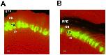 Figure 1. XCLÎQ-GFP expression in the specific cell-types in the transgenic photoreceptors.A. An image of a section from the XOP-XCLÎQ-GFP tadpoleretina. XCLÎQ-GFP is observed only in the cell bodies and inner segments of the rod photoreceptor cells. B. In a CAR-XCLÎQ-GFP transgenic retina, GFP accumulates only in the cone photoreceptor cells. CB: photoreceptor cell body; OS: photoreceptor outer segment; IR: inner retina; RPE: retinal pigment epithelium. The scale bar indicates 10 µm.