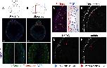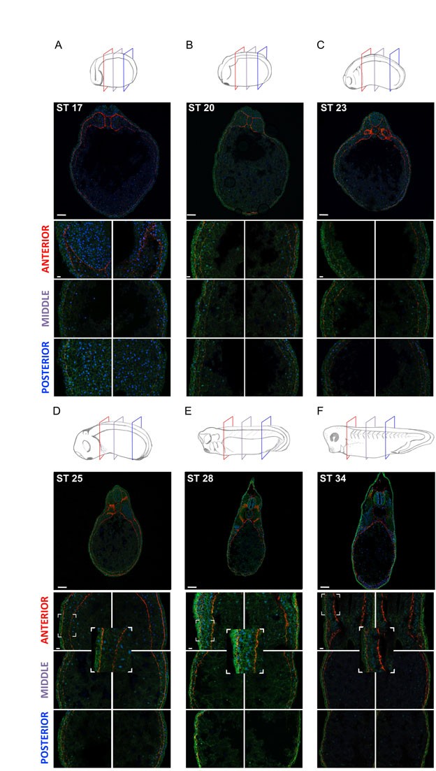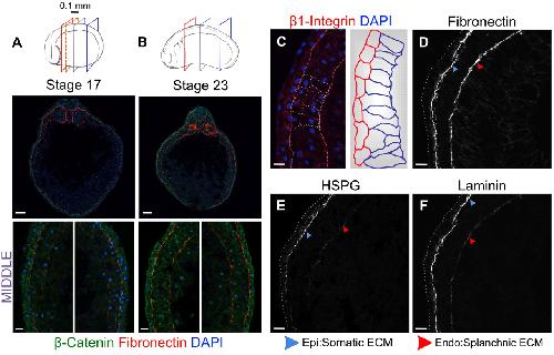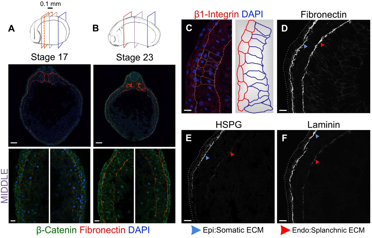 Fig. 1. Bilayered LPM is LR symmetrical from tailbud-tadpole stages with splanchnic-somatic structural differences beginning at stage 23. (A,B) Diagrams indicate stage/length and sectional planes. Analysis every 0.1 mm (dashed red frame) was between anterior-posteriorLPM extremes indicated by red/blue frames. Representative mid-embryo sections (purple frame) are shown. (A) Stage 17 (10Ã, 40Ã), left and rightLPM each comprising two layers. β-Catenin (green); DAPI (blue). Fibronectin (red) flanks epidermal/endodermal faces of left and rightLPM. (B) Stage 23: maintenance of bilayered left and rightLPM. (C) Left/right LPMs are structurally similar during these stages, but somatic/splanchnic layers become distinct, symmetrically, from stage 23; somatic cells are more squamous, splanchnic are more columnar. (D-F) Somatic and splanchnic LPM show different basal lamina compositions. Somatic: strong fibronectin, HSPG and Laminin signal; splanchnic: much weaker HSPG/Laminin signal, especially laterally. Scale bars: 100 μm, in top images A,B; 20 μm in bottom images A,B; 20 μm in C-F.