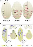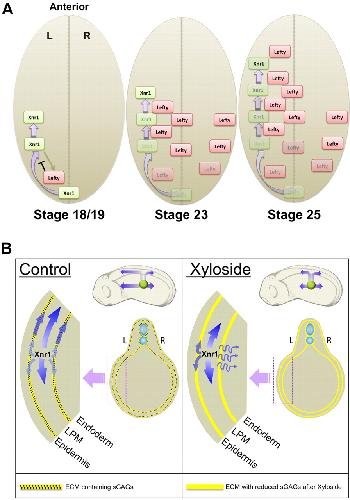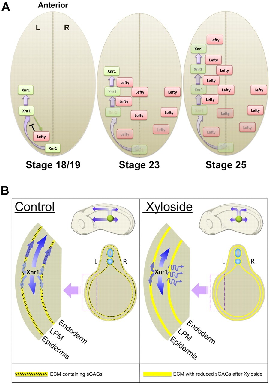 Fig. 7. Model for effect of sulfated glycosaminoglycans (sGAGs) during asymmetric gene expression. (A) Asymmetrically-produced Xnr1 in the leftLPM beginning at stage 18/19 begins to move anteriorwards, concentrated over ECM of leftLPM/periaxial tissue surfaces, and begins to induce Lefty. Lefty travels anteriorly along leftLPM/periaxial ECM more rapidly than does Xnr1, and into endoderm. Lefty catches up to Xnr1, shutting down Xnr1 autoregulation. Lefty stability may prevent a second Xnr1 wave from initiating. (B) sGAGs (stippling) within LPM and periaxial ECM (yellow line) help retain a significant fraction of Xnr1 in proximity to leftLPM, while Lefty (not shown) moves more freely to rightLPM either directly through endoderm or `up-and-over' the dorsal axial midline. sGAG removal allows lateral travel of Xnr1 into endoderm, reducing LPM signal and planar movement. This orthogonal transfer reduces the strength of Xnr1 autoregulation within the LPM.