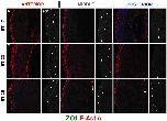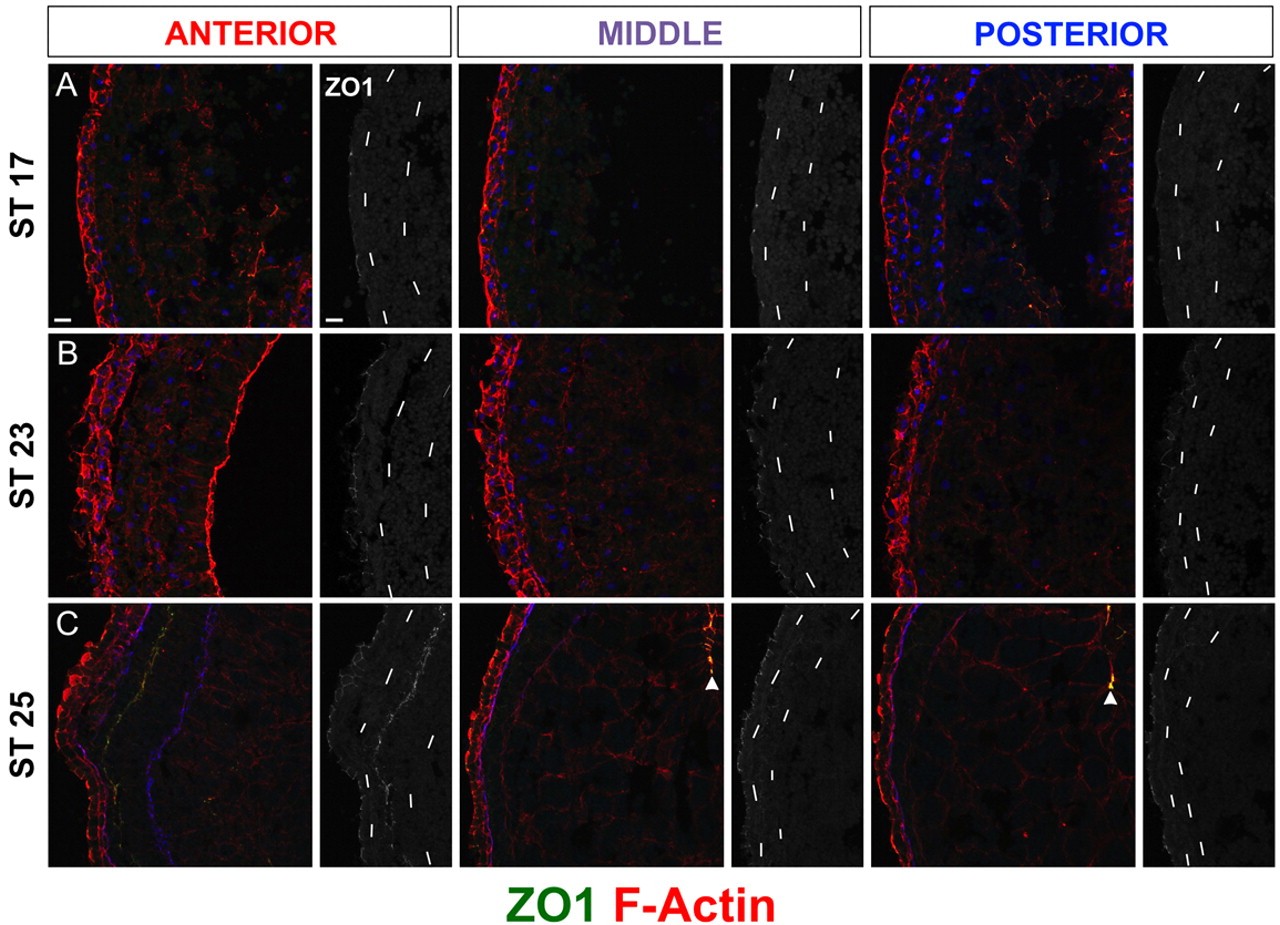 Fig. 2. LPM undergoes symmetric epithelial polarization after Xnr1/Lefty expression. Anterior, middle and posterior transverse cryosections showing F-actin (Phalloidin, red), ZO1 (green) and nuclei or ECM [blue, DAPI (A,B), Laminin (C)]; 40à images. ZO1 alone (left side shown) is in grayscale, chained lines indicate LPM epidermal/endodermal boundaries. (A) Stage 17, LPM is not yet polarized. ZO1 puncta indicate tight junctions in polarized epidermal layer; no puncta are apparent within LPM at stages before asymmetric Xnr1/Lefty expression. (B) Stage 23, unpolarized LPM during peak Xnr1/Lefty expression. (C) Stage 25, punctate ZO1 signal appears at somatic/splanchnic interface in anteriorleft and rightLPM; at this stage, asymmetric Xnr1/Lefty expression is waning. Arrowheads in C indicate ZO1 in epithelial archenteron. Scale bars: 20 μm.