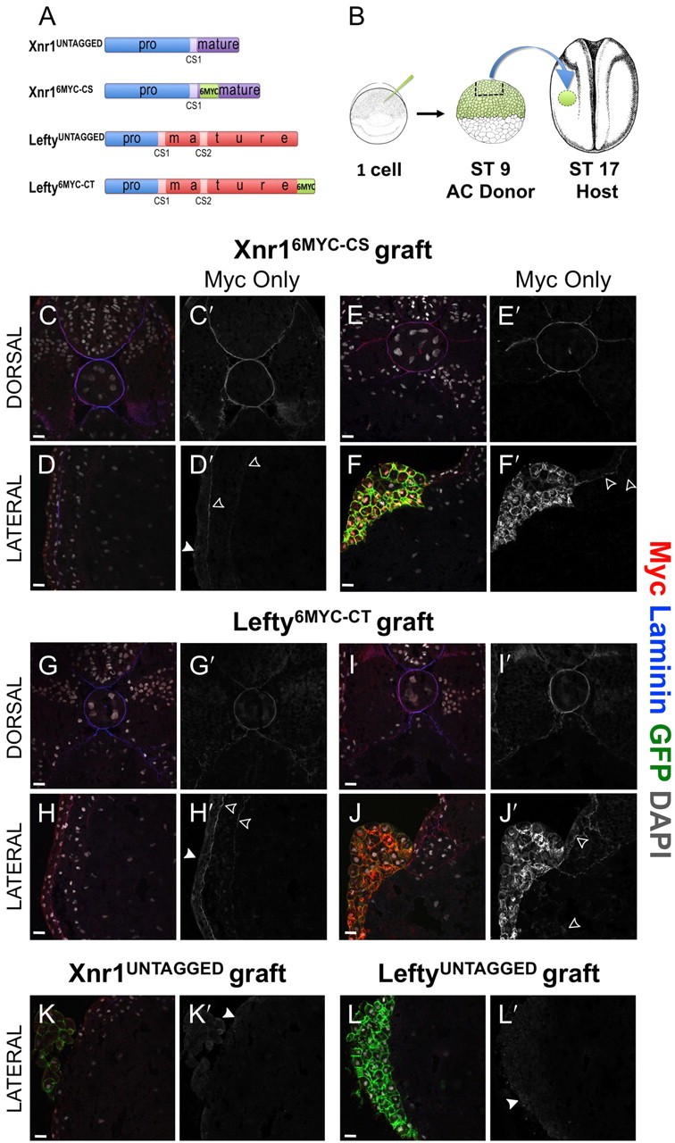 Fig. 3. Xnr16MYC-CS and Lefty6MYC-CT move substantially from AC grafts. (A) Xnr1 and Lefty constructs: blue box, pro-domain; CS1/CS2, cleavage sites liberating mature ligands; 6MYC tag was inserted just downstream of CS1 (Xnr1) or C-terminally (Lefty). (B) AC-grafting schematic. (C-Lâ²) Transverse cryosections were used to detect Myc (red; grayscale in Câ²-Lâ²), laminin (blue) and nuclei (DAPI, white); dorsal panels focus axially/paraxially, lateral panels on LPM. Membrane-bound GFP (mGFP, green) marks engrafted cells; 2.5 μm optical sections. Open arrowheads, Myc; closed arrowheads, nonspecific epidermal haze. (C-Fâ²) Xnr16MYC-CS, (G-Jâ²) Lefty6MYC-CT, (K,Kâ²) Xnr1UNTAGGED and (L,Lâ²) LeftyUNTAGGED. (C,Câ²,D,Dâ²) Representative section â¼110 μm anterior of graft margin; Xnr16MYC-CS signal in basal lamina surrounding notochord/neural tube. Dorsal and leftLPM Xnr16MYC-CS signal colocalized with laminin. (E,Eâ²,F,Fâ²) Representative images, dorsal and lateral Xnr16MYC-CS signal within/near graft. Note absence of endoderm signal. (G,Gâ²,H,Hâ²) Lefty6MYC-CT signal colocalized with laminin in dorsal and lateral views, â¼340 μm anterior of graft. (I,Iâ²,J,Jâ²) Dorsal and lateral images of Lefty6MYC-CT signal. Note Lefty6MYC-CT signal is within endoderm, not colocalized with laminin. (K-Lâ²) AC grafts with Xnr1UNTAGGED or LeftyUNTAGGED reveal artefactual hazy epidermal signal (closed arrowheads). Scale bars: 25 μm.