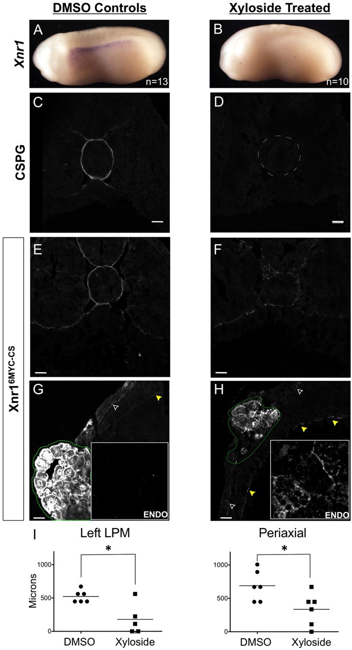 Fig. 6. Xyloside decreases leftLPM-restraint of Xnr1 signal and alters the distance traveled. (A,B) Endogenous Xnr1 expression in leftLPM of controls but complete absence from 80% of xyloside-treated embryos. (C,D) CSPG is found periaxially (around notochord) and at the somite/dorsal endoderm interface in DMSO-treated (n=9) embryos but is absent from all xyloside-treated embryos (n=11). (E,F) Xnr16MYC-CS grafts display dorsal periaxial signal, which is markedly reduced with xyloside treatment. (G,H) Dorsolateral leftLPM signal on ECM in controls and lack of endodermal signal (inset; graft, green outline). Xyloside-treated Xnr16MYC-CS engrafted embryos showed increased endoderm signal (inset), interstitial and intracellular. Note increased relative signal at splanchnic:endodermal ECM. Open arrowheads, epidermal:somatic ECM; yellow arrowheads, splanchnic:endodermal ECM. (I) Xyloside treatment reduces distance traveled by Xnr16MYC-CS along lateral and periaxial routes (Fig. 4). *Non-parametric Mann-Whitney test: Pâ¤0.05. Scale bars: 25 μm.