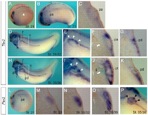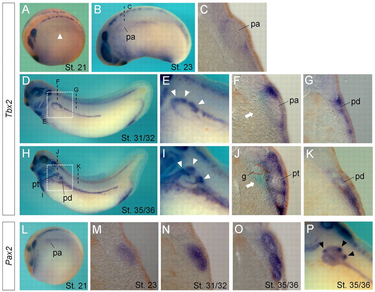 Fig. 1. Pronephric expression of Xenopus Tbx2 analyzed by in situ hybridization. (A,B) Expression of Tbx2 around the pronephric anlage (pa) at stage 21 (A) and 23 (B). Arrowhead indicates weakly expressed Tbx2 around the pronephric anlage. (C) Transverse section of the embryo in B at the level indicated by the dashed line. (D) Tbx2 expression surrounding the developing pronephric tubule and duct at stage 31/32. (E) Magnified view of the boxed area in D. Arrowheads indicate the increased expression of Tbx2 in the dorsal region of the pronephric tubule anlage. (F,G) Transverse sections of the embryo in D at the levels indicated by the dashed lines. The arrow (F) indicates the absence of expression of Tbx2 in the medial layer of the intermediate mesoderm (IM). (H) Tbx2 expression enclosing the pronephric tubule (pt) and duct (pd) at stage 35/36. (I) Enlarged view of the boxed region in H. Arrowheads point to the expression of Tbx2 around the tips of nephrostomes. (J,K) Transverse sections of the embryo in H at the levels indicated by the dashed lines. The pronephric glomus (g) is outlined in red in J. The arrow indicates Tbx2 expression in the non-glomus mesenchyme in the medial layer of IM. (L) Pax2 expression in the pronephric anlage at stage 21. (M-O) Pax2 expression in transverse sections of the pronephric anlage, tubule and duct at the indicated stages. (P) Strong expression of Pax2 in the tips of nephrostomes (arrowheads).