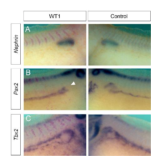 Fig. S4. Ectopic expression of WT1 expands the glomus domain and inhibits proximal tubule formation. (A-C) Embryos injected with WT1 RNA (200 pg) were subject to in situ hybridization for Pax2, Nephrin and Tbx2 at stage 32. Note that WT1 specifically impairs Pax2 expression in the pronephric tubules (arrowhead), whereas it increases Nephrin expression. Tbx2 expression is still detectable around the expanded pronephric mesoderm in the WT1-injected side of the embryo. Control, uninjected side.