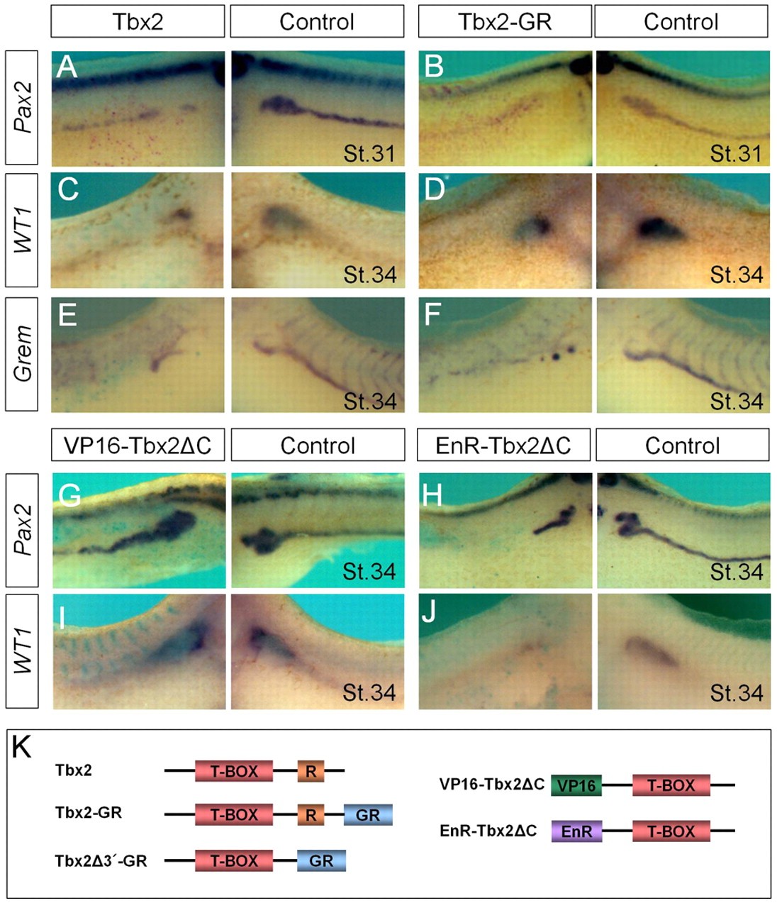 Fig. 2. Ectopic expression of Tbx2 inhibits pronephric nephron formation. (A-J) Xenopus embryos injected with Tbx2 (200 pg), Tbx2-GR (200 pg), VP16-Tbx2δC (100 pg) or EnR-Tbx2δC (100 pg) mRNA were treated (B,D,F) or otherwise (A,C,E,G-J) with dexamethasone (DEX) from stage 22 to 31 or 34 and then subjected to in situ hybridization for the pronephric markers Pax2, WT1 and Gremlin. The left and right images in each panel indicate the injected and uninjected control sides of the embryo, respectively. Of note, VP16-Tbx2δC disorganizes the pronephric tubules (G) and expands the glomus domain (I). (K) Tbx2 constructs used in the injection experiments. T-BOX, T-box from Tbx2; R, repressor domain of Tbx2; GR, human glucocorticoid receptor ligand-binding domain; VP16, transactivation domain of VP16; EnR, transrepression domain of Engrailed.