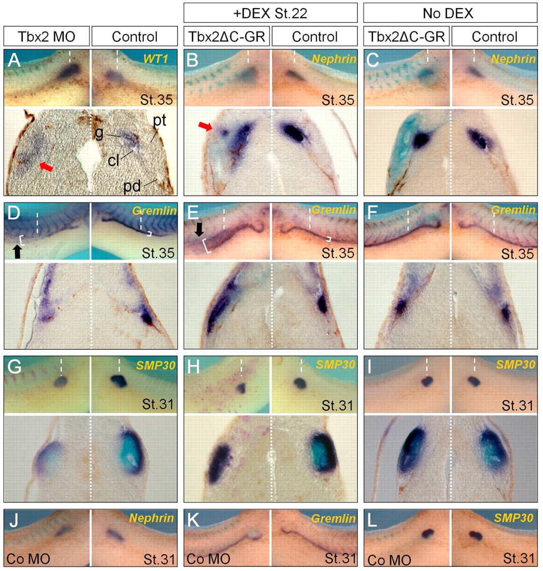 Fig. 3. Loss of Tbx2 function expands the territory of the pronephric duct and glomus but not the tubule. (A-L) Xenopus embryos injected with Tbx2 MO (10 ng), Tbx2δC-GR (200 pg) or control MO (Co MO, 10 ng) were subject to in situ hybridization for the glomus-specific markers WT1 and Nephrin and the duct-specific marker Gremlin at stage 35 or the tubule-specific marker SMP30 at stage 31. To activate injected Tbx2δC-GR mRNA, embryos were treated with DEX from stage 22 to 35 (B,E) or to 31 (H). (A-I) Stained embryos are shown in the upper part of each panel and transverse sections at the levels indicated by the dashed lines are shown below. Left and right parts of each panel show the injected and uninjected control sides, respectively. cl, coelom; g, glomus; pd, pronephric duct; pt, pronephric tubule. Arrows in A,B indicate WT1 and Nephrin expression in the somatic layer of the intermediate mesoderm, respectively. Arrows and bracket in D,E indicate migrating Gremlin-expressing cells and the diameter of pronephric duct, respectively. (J-L) Control MO has no effect on the expression of Nephrin, Gremlin or SMP30.