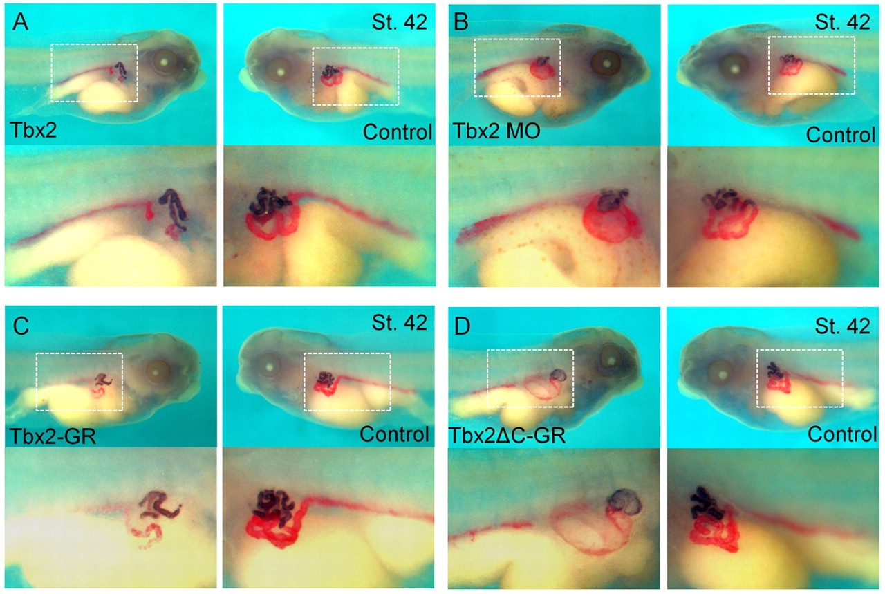 Fig. 4. The pronephric nephron is enlarged by inhibition of Tbx2 activity. (A-D) Xenopus embryos injected with Tbx2 mRNA (200 pg), Tbx2 MO (10 ng), Tbx2-GR (200 pg) or Tbx2-delta-C-GR (200 pg) were double stained using pronephric tubule- and duct-specific antibodies (3G8 and 4A6, respectively) at stage 42. To activate injected Tbx2-GR and Tbx2-delta-C-GR mRNA, DEX treatment was from stage 22 to 42 (C,D). Left and right parts of each panel show the injected and uninjected sides of embryos, respectively. Magnified views of the boxed areas are shown beneath.